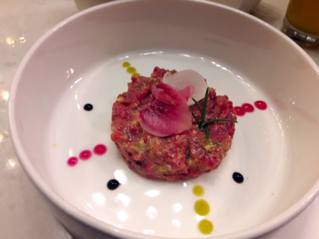 Atún picado en crudo t macerado con mostaza y Piña.