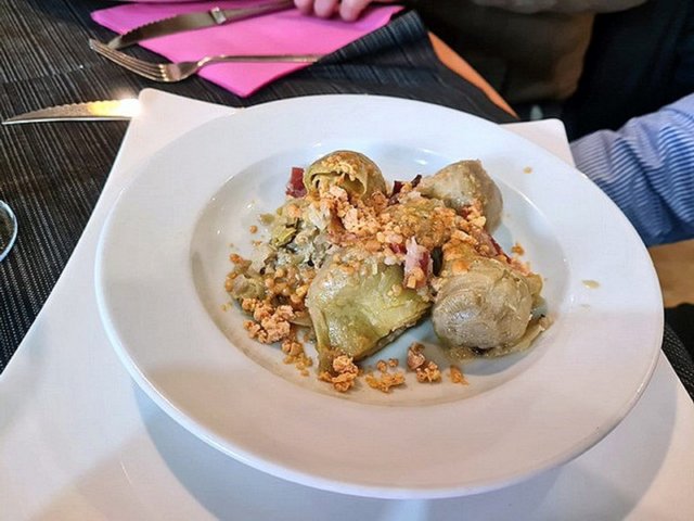 Ensalada variada con Pulpo, crujiente de Beicon y vinagreta de Mango