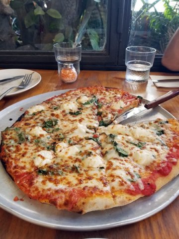 Pizza Vegetal. Olivas, pimiento asado, tomate y cebolla.
