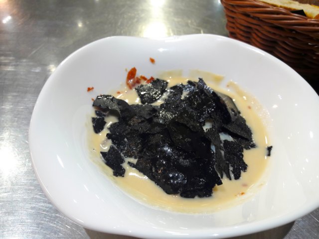 Canelón sobre una base de Cuscús, relleno de Pollo bajo una salsa de Ajos frescos y Pimentón