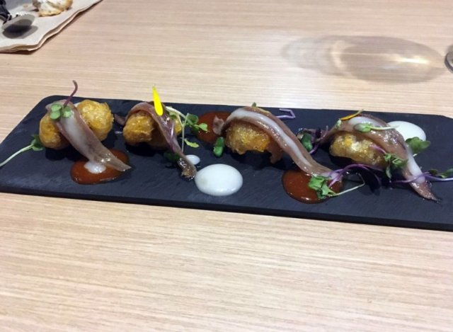 Migas en dos texturas con mouse de Longaniza y esferificaciones de Mosto.