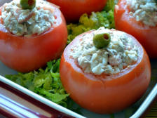 Ingredientes:6 Tomates manzano2 latas de Atún1 taza de Arroz cocido3 cuch. de Mayonesa1 chorrito Vinagre blancoAceitunas para decorar Sal Pimienta al gusto