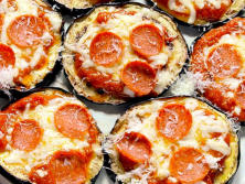 Ingredientes:2 Berenjenas grandes Aceite de oliva virgen extra, Sal kosherPimienta negra recién molida1 c. Marinara1 c. Mozzarella rallada1/2 c. mini Pepperoni1/2 c. Parmesano triturado1/4 c. Albahaca