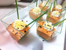 Ingredientes:3 Pimientos de Piquillo1 Huevo cocido4 palitos de Surimi 1 lata de Atún escurrida2 cuch. de Mayonesa 8 Huevos de CodornizCebollinoSésamo negro