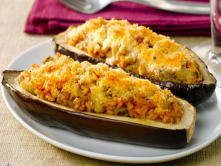 Ingredientes:1 Berenjena por persona Arroz al gusto1 lata de Atún al natural ½ Cebolla 2 cditas de Aceite 1 chorrito de Nata 1 Huevo 1 loncha de Queso por cada Berenjena