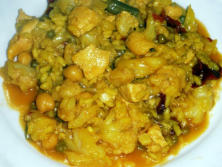 Ingredientes:Unos arbolitos de Coliflor1 Ñora 2 Ajos1 cuch. de tomate 1 cuch. de pimentón1 puñado de garbanzos, guisantes y judías verdes2 filetes de pechuga de pollo