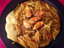 Ingredientes:1 Kg. de MejillonesAtúnGamba arroceraUn trocito de pimiento verde y rojo½ cebolla2 cucharadas de tomatePimentón dulce1 hoja de laurel2 ajosFideuá (fideos gruesos)