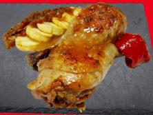 Ingredientes:2 muslos de Pollo por persona 6 Cebollas dulces grandes6 dientes de AjoTomillo frescoRomero100 ml de vino blanco2 ramas de Perejil muy picadoManteca de cerdoSal PimientaPatatas1 Pimiento rojo