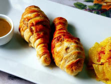 Ingredientes:6 Muslos de Pollo1 cuchta de Orégano seco1 cuchta de Tomillo seco1 cuchta de Curry amarilloSal PimientaMostazaMermelada de Cebolla caseraAceite de oliva1 Huevo batidoMasa de hojaldre