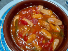 Ingredientes:1 Pechuga de PolloPimientos de 3 colores2 cuch. Tomate natural.1 Cebolla medianaSalAceite de olivaVino blancoMaicena diluida1 hoja de Laurel