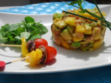 Ingredientes:1/2 kilo de salmón fresco.2 aguacates.1 cebolleta.1 mango1 limón o lima.1 cucharadita de mostaza dijon.4 cucharadas de salsa de soja.Aceite de oliva.