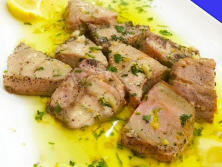 Ingredientes:400 gr de lomo de Atún 1 vasito (150 ml) fino de Jerez2 dientes de Ajo Perejil picadoAceite de oliva virgen extraSal PimientaEl zumo de medio Limón