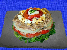 Ingredientes:2 latas de Atún 500 gr. de Patata.500 gr. de Pimiento rojo.1 cogollo de Lechuga.Aceite de oliva virgen extra.2 Huevos.4 chdas. de Mayonesa.Sal.