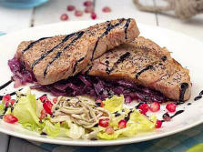 Ingredientes:2 lomos de Atún1 Cebolla moradaAjo en polvoPimienta negraSalPara la ensalada:Escarola1 Granada2 latas de Gulas al ajilloCrema de vinagre de MódenaSal