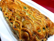 Ingredientes:1 plancha Hojaldre rectangular400 gr. Lomo de Salmón 250 gr. de hojas de Espinacas1 cuch. de Harina 30 gr. de Mantequilla200 gr. de LecheSalPimienta1 huevo