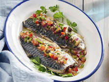 Ingredientes:4 Caballas1 Cebolla roja1 diente de Ajo2 Tomates½ Pimiento rojo½ Pimiento verde40 g de Alcaparras100 g de Aceitunas negrasAceite de olivaSalPimientaVinagre de JerezSalsa de SojaPerejil