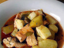 Ingredientes:2 Chalotas1 Pimiento verde750 gr. de Patatas2 cuchtas pasta pimiento 250 gr. de Salmón fresco300 gr. de Sepia 1 l. de caldo de PescadoAceiteSalEneldo seco