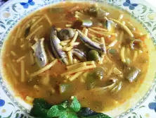 Ingredientes:Aceite de oliva virgenTomatePimiento½ Cebolla3 dientes de AjoUn puñado de HabasUn puñadito de Guisantes2 Patatasc cuchta. AzafránSalPimientaFideosHierbabuenaBoquerones