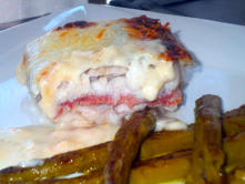 Ingredientes:1 Merluza de 1,5 Kg.100 gr. de Jamón serrano2 briks de nata líquida ½ baso de lecheQueso rallado, parmesano SalMantequilla1 bote de espárragos verdes