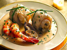 Ingredientes:8 lomos de Gallo 12 Langostinos 250 g de Almejas lavadas150 ml de Nata líquida100 ml de Cava 1 yema de Huevo 1 diente de Ajo 10 tallos de CebollinoMantequillaPimienta Sal.
