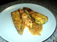 Ingredientes:Rodaballo partido a tiras.Harina, aceite y sal.Gambas peladas.Almendras tostadas.Un ajo y perejilUna pizca de azafrán.Zumo de dos naranjas ½ limón.