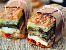 Ingredientes:Salsa Pesto1 Pimiento rojo 1 BerenjenaAceite de oliva Sal kosher y Pimienta recién molidaQueso de cabra suave Queso mozzarella fresco 1/3 lb de jamón en rodajas 1 Pan chapata