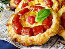 Ingredientes:6 Salchichas tipo alemanas.6 Espaguetis (sin cocer)6 Empanada hojaldre 10 cm2 cdas. de salsa de Tomate1 taza de Queso rallado6 tomates CherryAceite de oliva a gustoHojas de Albahaca a gusto