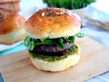 Ingredientes:1 Pan de Hamburguesa3 cdas salsa Pesto3 Tomates secos1 loncha de Panceta1 cda Aceite de oliva1 steak de carne picada (de ternera, cerdo, pollo... tu preferencia)1 rodaja de Mozzarella frescaPimientaSal