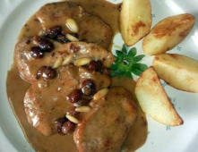 Ingredientes:1 Solomillo de Cerdo laminado25 gr. de Uvas Pasas 25 gr. de Piñones400 ml. de Nata (para cocinar)1 Copita de Brandy1 Copa de Vino Pedro XimenezAceite de OlivaSal Pimienta Negra Molida