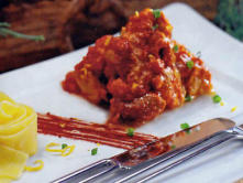 Ingredientes:1 Kg. Magro de Cerdo ibérico2 Cebollas3 Zanahorias10 cuch. Tomate triturado½ Diente de Ajo2 cuchtas. Pimentón de la VeraAceite de OlivaSalCaldo de carne200 ml. Nata agriaPasta fresca