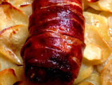 Ingredientes:2 solomillos de cerdo2 dientes de ajo4 patatasAceite de oliva virgenPerejil frescoMostaza antigua8 ó 10 lonchas de panceta o bacon1 vaso de vino blancoSal en escamasPimienta