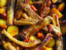 Ingredientes:2 Kg. Costilla de cerdo 200 gr. Cebolla 3 Dientes de ajo 200 gr. Chorizo tierno 100 gr. Bacon 1 lata de Cerveza5 gr. Pimentón dulce Tomillo fresco unas ramitasLaurel una hojaMiel 2 cucharadas soperas
