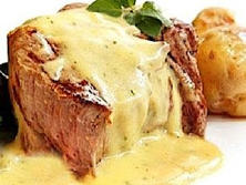 Ingredientes:1 ½ de solomillo de Cerdo150 gr. de Queso azul1 copa de vino Moscatel1 Cebolla2 dientes de AjoPatatas Caldo de verdurasAceite Oliva virgenSalPimienta