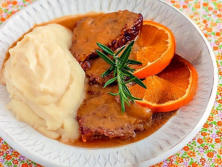 Ingredientes:1 kg. de lomo de Cerdo1 Cebolla2 Naranjas2 dientes de Ajo1 vaso de Vino blanco2 cuch. de Miel1 ramita de Romero1 ramita de TomilloSal Pimienta