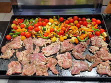 Ingredientes:1250 gr. Filetes cerdo1 Calabacín blanco1 Calabacín verde750 gr. Tomates Cherry 3 Pimientos tricolor.1/2 Cabeza ajosPerejilSalPimientaAceite de oliva virgen extra