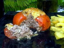 Ingredientes:7 Tomates grandes0.5 kg de Carne cerdo picada1.5 Cebolla333 gr de Champiñones láminas 1.5 cuch. de Harina0.5 vaso de LecheSalPimienta molidaNuez moscada4 cuch. de aceite de oliva Queso Emmental rallado