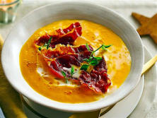 Ingredientes:Para la crema: 800 gr de Calabaza 1 Puerro 300 ml de Leche de coco2 cuch. de CurryAceite de olivaSal.Para acompañar: 100 gr de jamón ibéricounos Berros Un poco de Leche de coco.