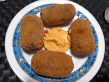 Croquetas de Pollo con Salsa Quesos Dip  Elaboración:  Hacemos la bechamel igual que en otras recetas de esta WEB y sección. Mezclamos la bechamel con el pollo cortado en trozos muy pequeños. Lo dejamos en el frigorífico unas 12 horas. Lo conveniente es hacerlo el día anterior. Con un par de cucharas damos forma a las croquetas. Batimos los huevos, y pasamos las croquetas por él. De aquí directamente al pan rallado y reservamos en un plato o fuente. Y se dejan de nuevo en el frigorífico al menos una hora. Vamos cocinando las croquetas a fuego alto. Freímos las croquetas en aceite de oliva bien caliente, en tandas de cuatro o cinco cada vez. Si deseamos que no sepan a aceite las freimos con aceite de girasol.  Emplatado:  Servir calientes.  Comentario:  La salsa de Quesos Dip, es un condimento, que lleva 4 quesos y verduras. Se vende comercialmente. Receta propia
