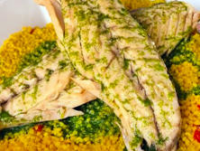 Ingredientes:250 gr. de Cuscús 1 o 2 latas de Caballa1 Tomate grande 1 Pimiento verde o Un trozo de Pimiento rojoMedia Cebolleta2 ó 3 limones grandesSalUna cuch. de curry en polvoUn manojo de perejil fresco Aceite de oliva