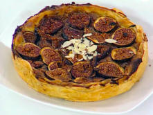 Ingredientes:300 g de higos frescos200 g de hojaldre congelado100 g de mantequilla50 g de almendras laminadas2 ½ dl de leche50 g de azúcar2 yemas de huevo1 vaina de vainilla1 cucharadita de harina de maízCáscara de limón