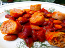 Ingredientes:8 salchichas ahumadas250 gr. de frijoles ya cocidos200 ml de salsa de tomate1 chalota pequeñaAceite de oliva virgen extra Sal Pimienta al gusto