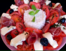 Ingredientes:7 Tomates firmes2 Cucha. de Mozzarella 2 Tazas de Arroz Basmati10 Aceitunas negras6 Rebanadas de JamónAlbahacaAceite de olivaSal y pimienta