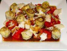 Alcachofas en ensalada  Elaboración:  Cortar el tomate en gajos. Mezclar el vinagre con el aceite y el zumo de limón. Añadir sal y pimienta. Hacer unas lascas finas de parmesano (puedes utilizar un pela patatas). Mezclar en un bol las Alcachofas cortadas en cuartos, los tomates y las  aceitunas.  Emplatado:  Servir como plato frío individualmente  Comentario:  Las alcachofas originalmente procedente del Mediterráneo occidental. Introducido y cultivado en numerosos países templados en todo el mundo.