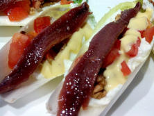 dados de tomate sobre el queso. Regamos cada endivia rellena con la