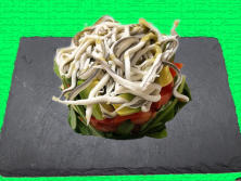 emplatar en un plato, echar dentro un puñado de canónigos y rúcula, a
