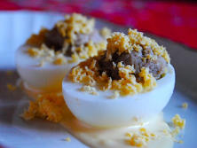 Ingredientes:10 Huevos1 Cebolleta1 diente de AjoAceite de Oliva virgen extra250 gr. Níscalos150 gr. Camarones450 ml. de MayonesaVinagre de Vino blancoPerejil picado400 ml. de Nata para cocinar
