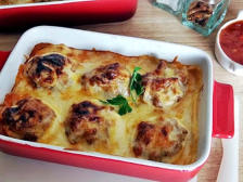 Ingredientes:8 o 10 Huevos. 400 grs de Carne picada.1/2 Cebolla.1 Ajo.Aceite de oliva.1/2 Bote de tomate frito SalPimienta Orégano.Queso rallado para gratinar.Salsa Bechamel.
