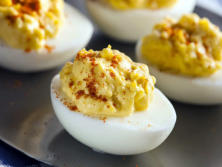 Ingredientes:4 Huevos duros 2 cuch. de Mayonesa ½ cuchta de Vinagre de Sidra ½ cuchta de Mostaza 1 cuchta de Pimienta negra¼ cuchta de Sal ½ cuchta de Pimentón picante