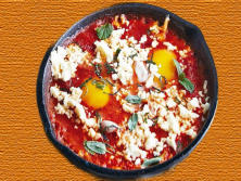 Ingredientes:8 Huevos1 taza de Queso feta 1/2 Cebolla picada2 dientes de Ajo picados5 Tomates picados1 taza de caldo de Pollo15 hojas de Menta fresca2 cuch. de chile en polvo1 pizca de Comino3 cuch. de Aceite de oliva