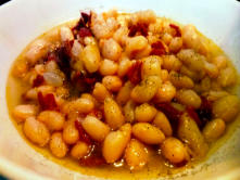 Ingredientes:1 bote de Judías Blancas3 lonchas de Jamón Ibérico3 Cebollas4 Dientes de Ajo2 o 3 Cayenas2 Hojas de LaurelPimentón DulceCaldo de verdura Sal